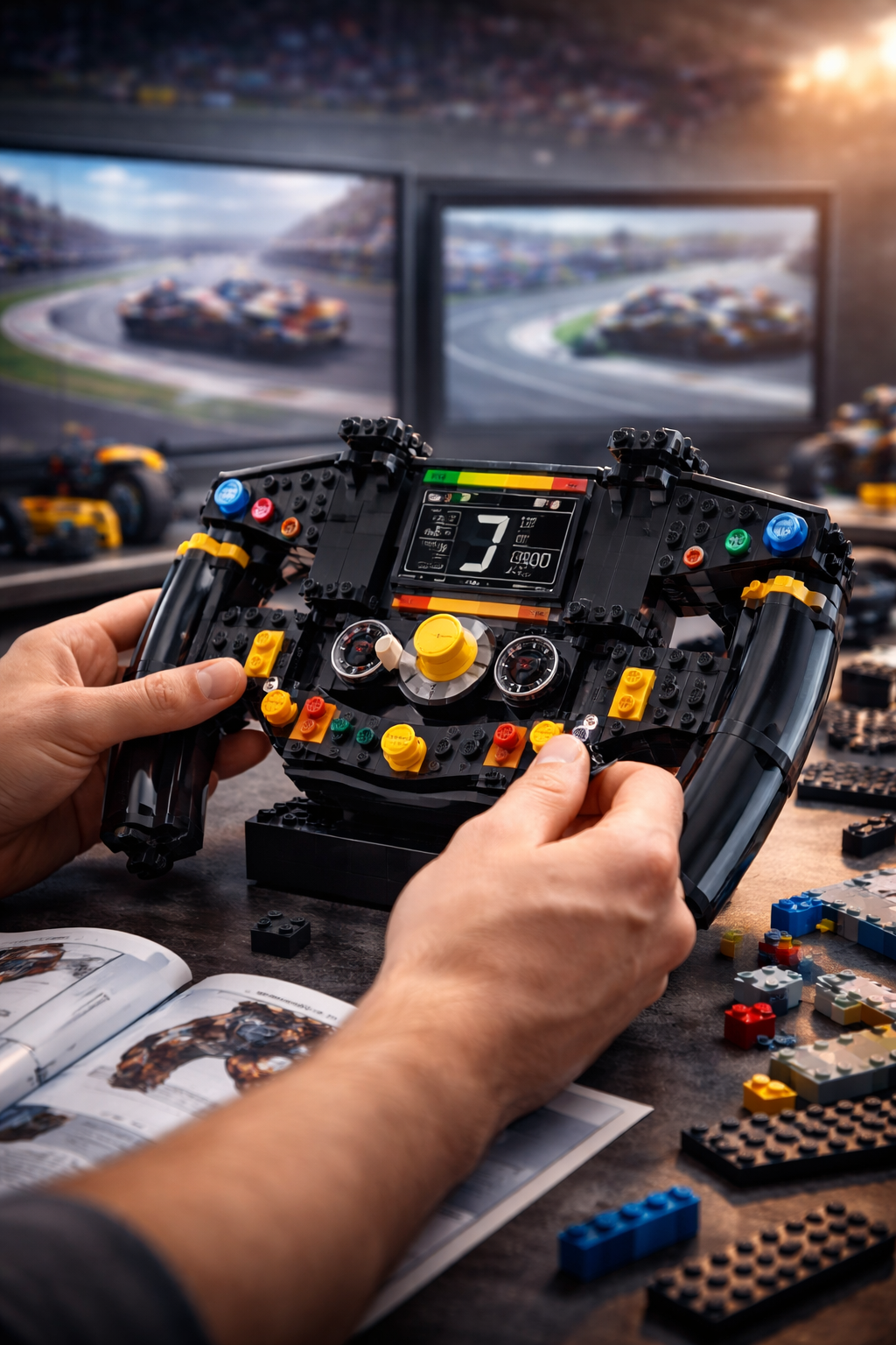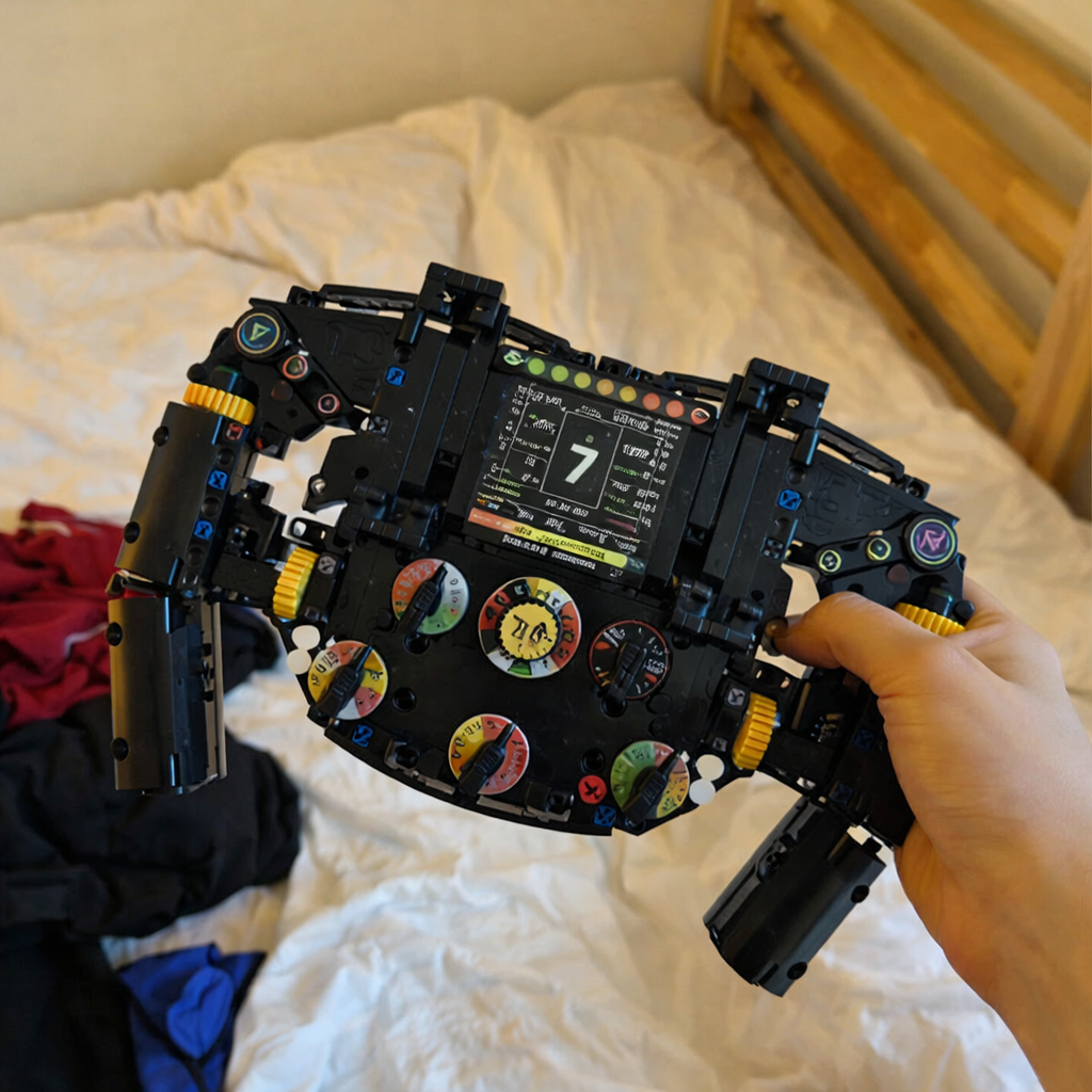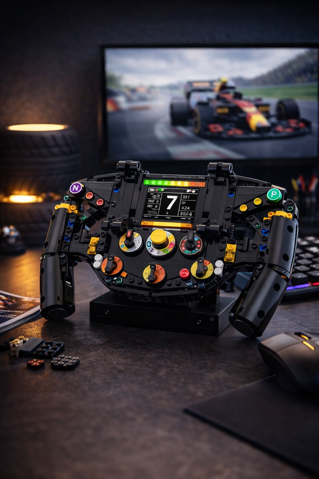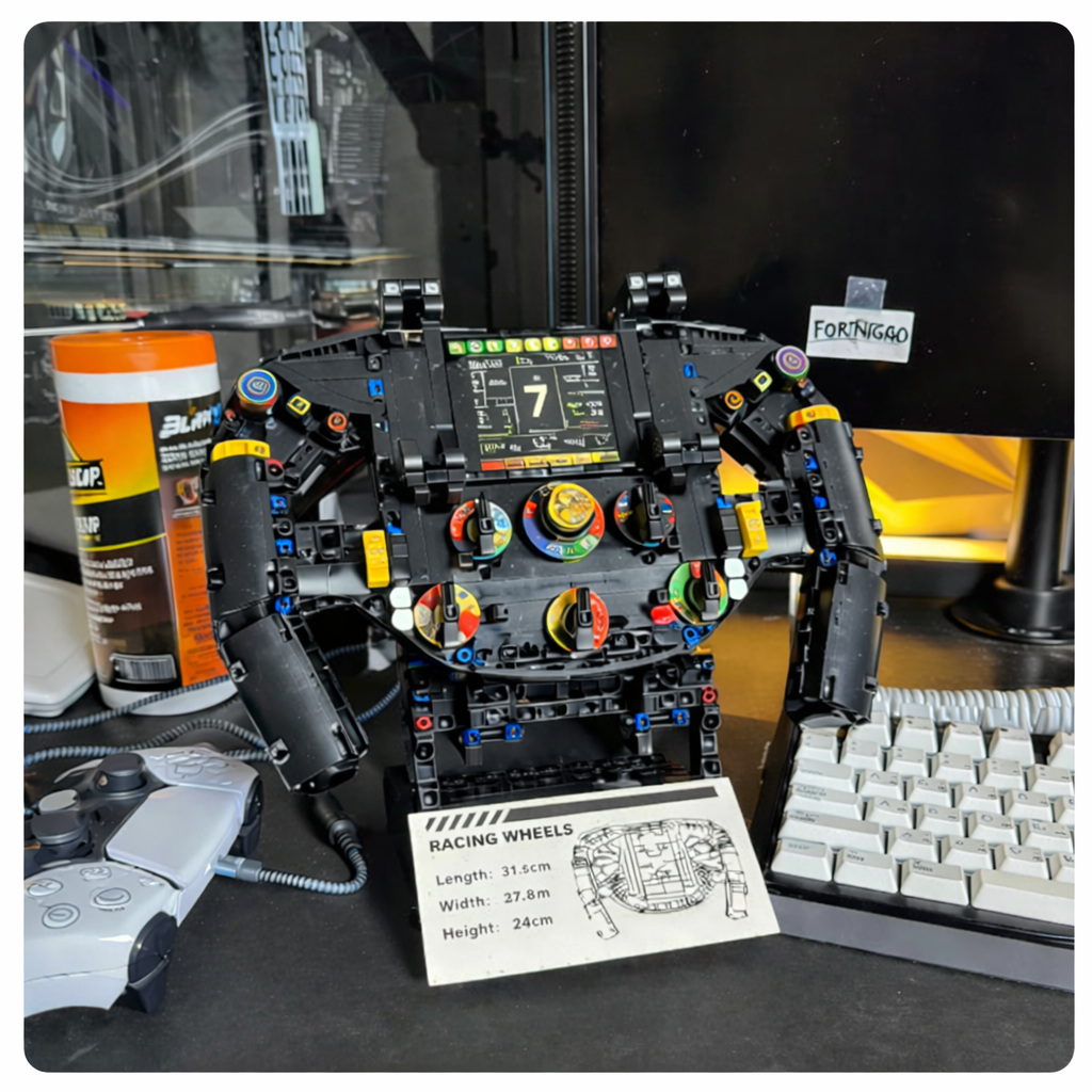 Feel race-day energy as you build your own racing-style steering wheel. Inspired by real track design, this model delivers bold details and a powerful display piece for your desk.